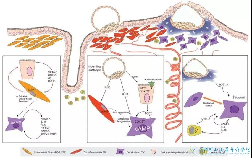 多种旁分泌和自分泌途径促进子宫内膜的蜕膜化进程,蜕膜过程的调控受子宫内膜不同细胞成分(包括上皮细胞、基质细胞、局部免疫细胞和脉管系统)分泌的形成素、生长因子和细胞因子的控制。蜕膜过程一旦启动,就会不断演化,从急性炎症起始表型向抗炎、高分泌表型转变,蜕膜基质细胞的炎性分泌与种植窗期植入胚胎建立分子交流相一致。一旦腔上皮被破坏,蜕膜基质细胞包围侵入的胚胎,并产生适量的分泌反应。蜕膜基质细胞、胚泡细胞和巨噬细胞所产生的趋化因子和细胞因子将引导间质和血管内滋养细胞的迁移。
