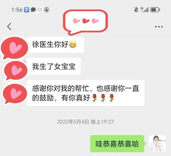 一路走来,这才与小宝宝见面了。许女士夫妇欣喜之余也不忘给徐芬医生发来好孕报喜的消息,一起分享这份喜悦。