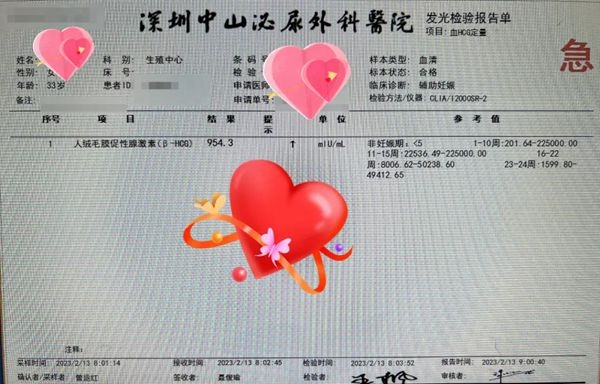 2023年1月,复苏冷冻移植2个优胚,没想到顺利迎来好孕啦;3月9日超声检查结果显示:宫内双胎妊娠!
