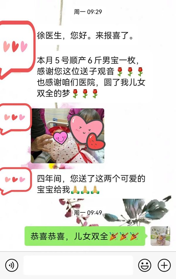 方女士成功凑成了“一儿一女”,生产之后不久还不忘给徐士儒主任发来报喜的消息,一起分享这份得之不易的喜悦!