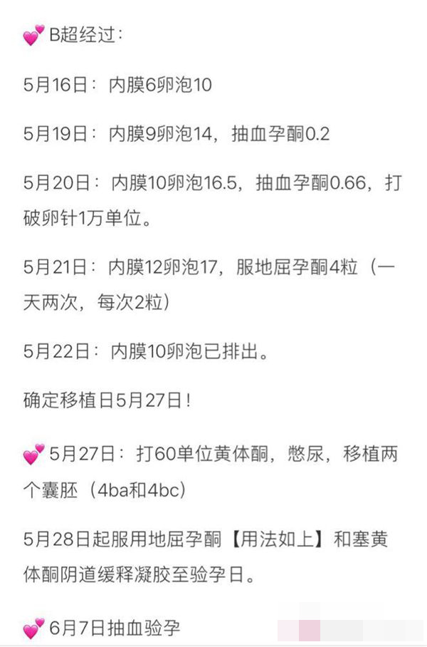自然周期因为不想错过排卵,所以卵泡长到14之后就连续回医院监测,用了一周时间就定了移植日5月27日。因为想增加成功率,我和医生商量后移植了两个囊胚,4BA和4BC。移植后做了个低频,听说是帮助着床的。移植后我照常生活,没有每天去躺着,也并没去想着是否着床,该工作时就工作,没有工作就听听歌刷刷微博,上上抖音乐呵乐呵,日子颇为佛系,轻轻松松的过每一天。