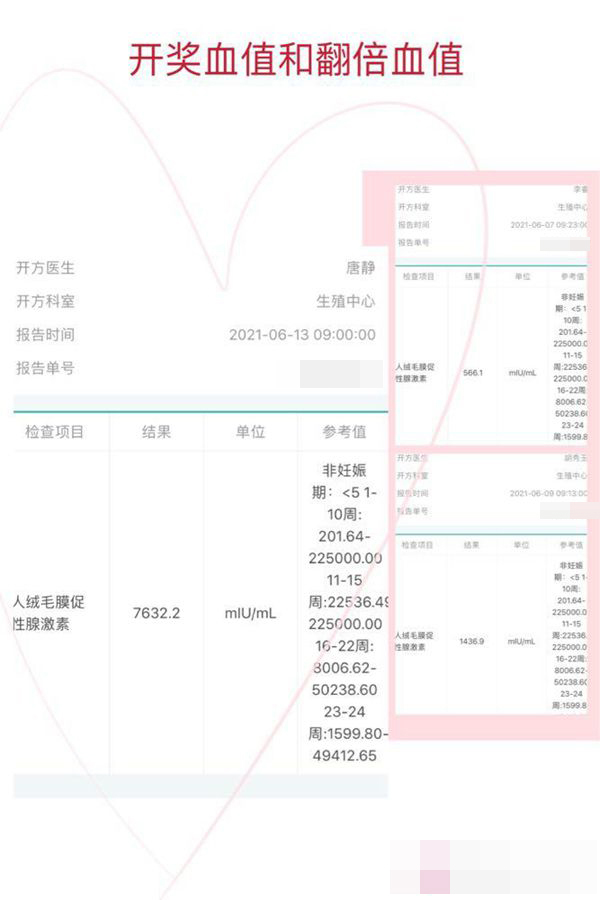 6月11日翻倍血值1436.96月13日翻倍血值7632.2,确定了宫内孕,心想事成地接到了一个小天使,有卵黄囊了。虽然另外一个小天使没有选择我,可能是因为没有缘分吧,已经选择我做妈妈的,我心怀感恩!谢谢你!6月24日一超,顺顺利利接胎心胎芽,希望健健康康的发育!求往后一路绿。
