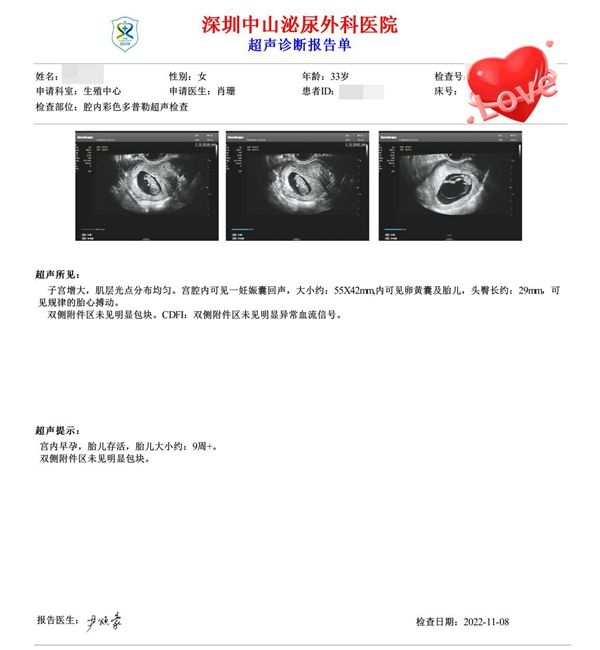 期间还发现有左侧输卵管积水,移植前做了腹腔镜下左侧输卵管结扎术。9月份,顺利移植1个囊胚,一次验得好孕,11月8日,B超检查显示:单胎存活,顺利“毕业”啦!