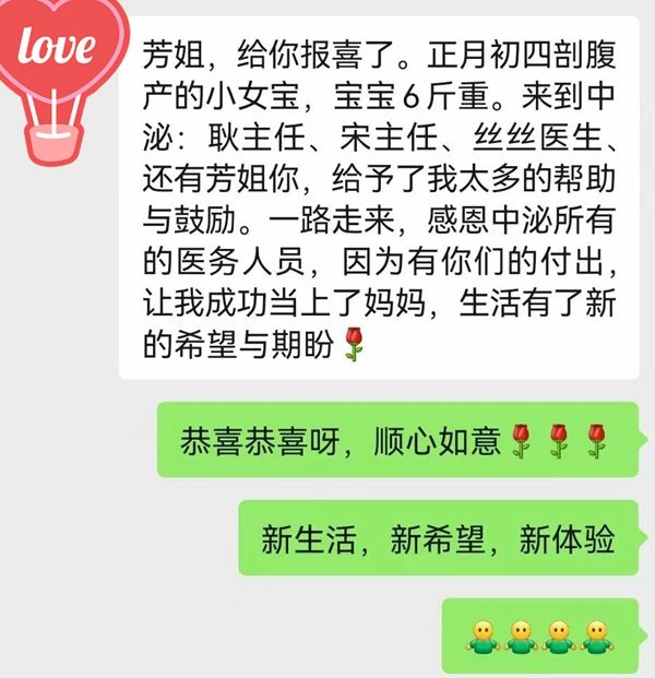 “一路走来,感恩中泌所有的医务人员,因为有你们的付出,让我成功当上了妈妈,生活有了新的希望与期盼”!尤其要感谢深圳中山妇产医院生殖助孕中心的耿蔷主任团队,生殖泌尿男科宋明哲主任,对我的帮助颇多。