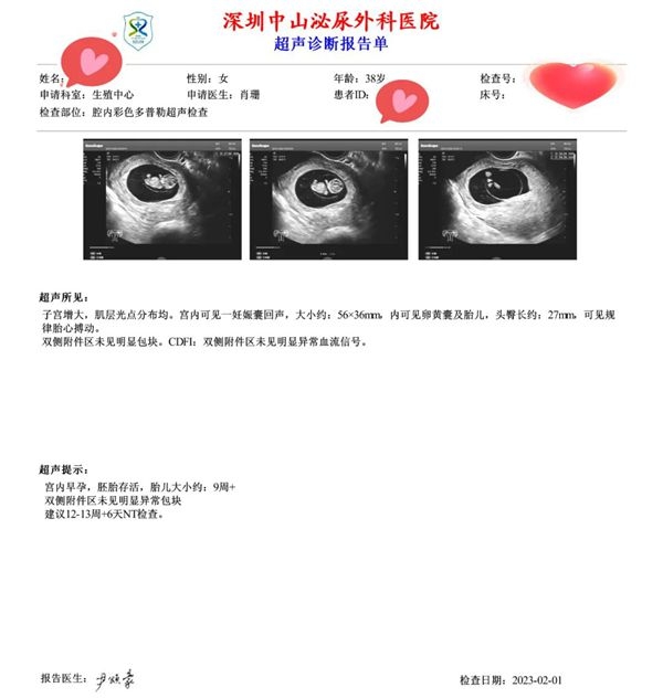 2022年12月份,复苏冷冻移植1个囊胚,验得好孕。可喜可贺,2023年2月1日B超检查结果显示:宫内单胎存活!
