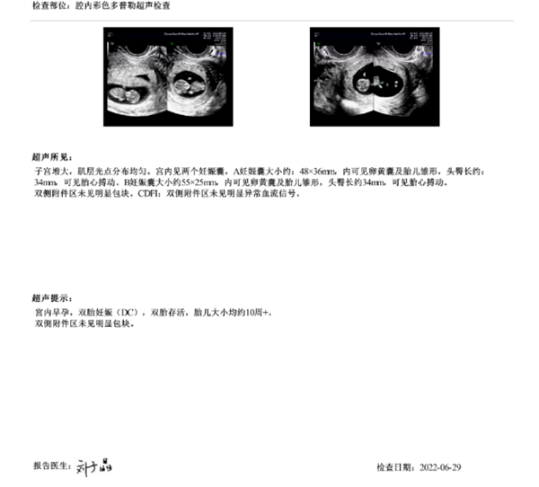 2022年5月,经过莫主任的评估,移植2枚囊胚后成功怀了,超声检查结果显示:宫内双胎妊娠!