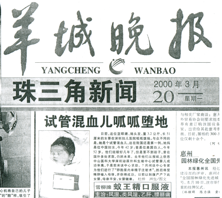 日前,这蓝眼睛、褐头发、重3.2公斤、长51厘米的女婴在深圳妇儿医院呱呱堕地。与众不同的是,她是个试管混血儿,这在我国还是第一例。她妈是位中国妇女,今年42岁;爸爸是位美国白人,今年52岁。他们结婚好几年了,但是要不到孩子,曾在国外多处求医,仍然未果。去年他们从报纸上获悉中国医科大学深圳泌尿外科生殖中心试管婴儿妊娠率高,于是前来该中心求助。7月间该中心专家为他们进行了“卵泡胞桨内精子注射术”,然后将受精卵植入母体,并获得成功。日前以剖腹产下此女婴,母亲平安,女婴健康.