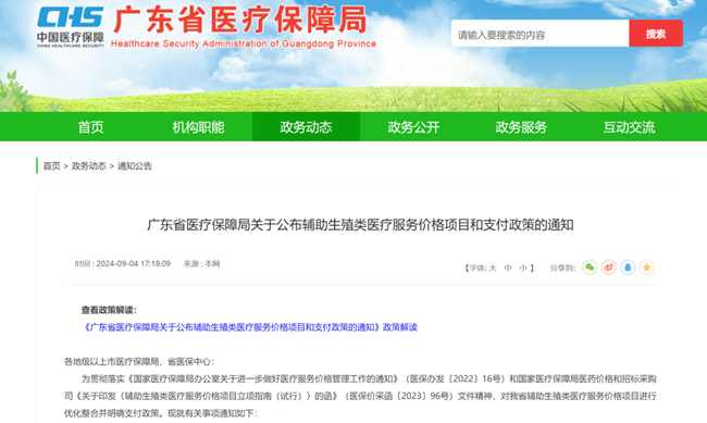9月4日,广东省医保局官网发布了《广东省医疗保障局关于公布辅助生殖类医疗服务价格项目和支付政策的通知》(以下简称《通知》),广东根据国家部署,将部分治疗性辅助生殖技术项目纳入医保支付范围,自10月1日起施行。